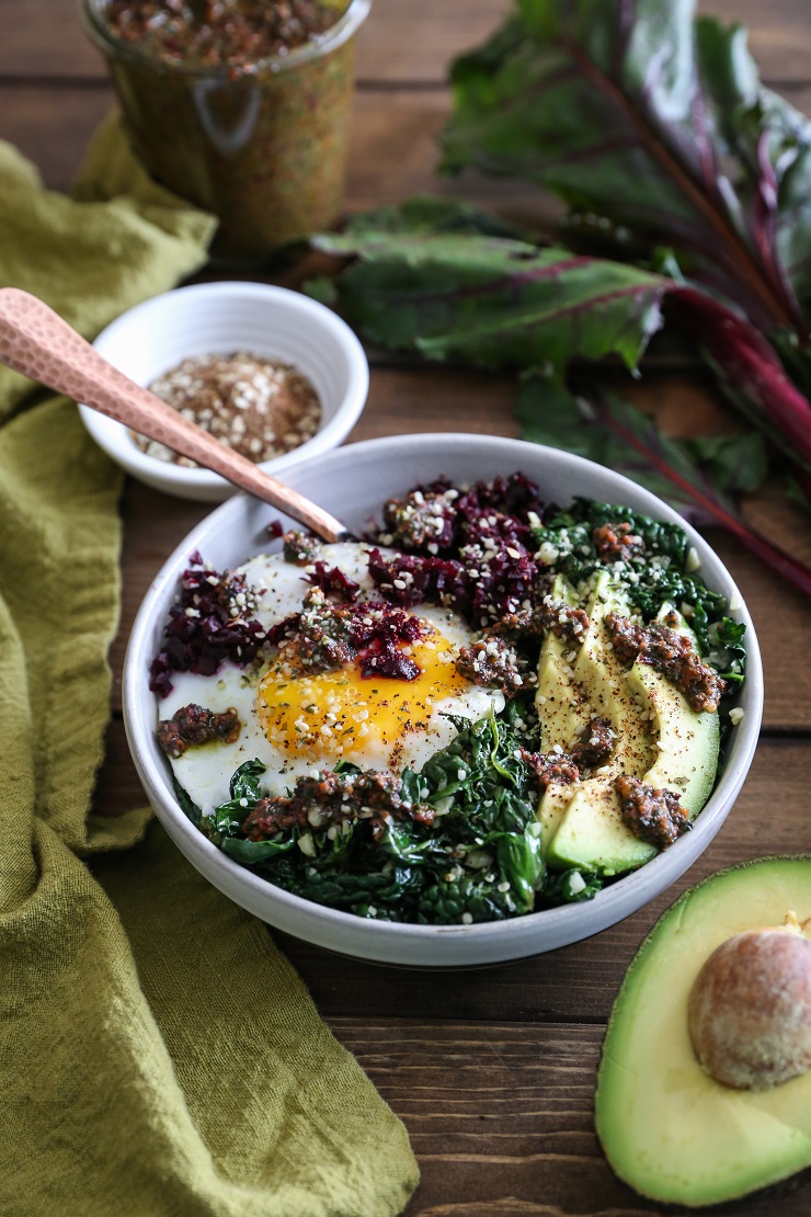 - Divide the beet rice and sauteed garlic between two bowls. Serve bowls with beet green pesto, or any pesto sauce of choice, along with a hefty portion of avocado and sunnyside up (or poached or fried) eggs.