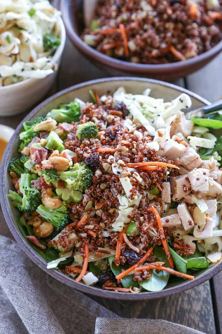 My favorite salad is a salad that has multiple “salads” wrapped into it. It’s a salad that has some broccoli salad, some cabbage slaw, some quinoa salad, a lean protein source, an epic fuckton of greens, a tasty dressing, perchance some feta, and a shower of nuts and dried fruit.