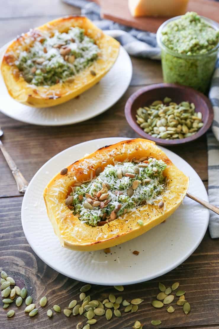 Roasted spaghetti squash with homemade broccoli and pumpkin seed pesto makes for a light yet filling and nutritious dinner – perfect for post-holiday eats!